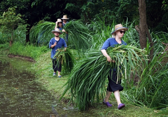 - Find some food for elephants ( cut grass and sugar cane from our organic farm area ).